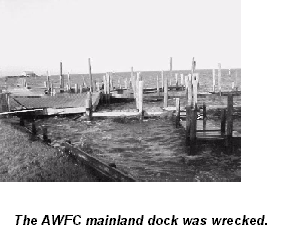 The high water flooded the keepers house at the lighthouse and turned the back road into a deep canal. The constant winds destroyed what was left of many of the island's sand dunes. Neighboring Portsmouth Island, which also is part of Cape Lookout National Seashore, fared worst than Davis. The storm cut a new inlet just north of the current Drum Inlet, and damaged the dock at the Long Point camp. High water flooded campers parked at the camp. To keep up with damage assessments on Davis, check Jack's web page ¾